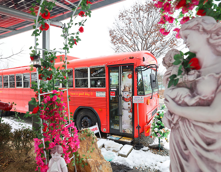 - 버스카페와 실내카페를 운영하고 있습니다. - 다양한 차와 음료 및 붕어빵을 판매하고 있습니다. - 이용시간 : 오전10시~오후9시